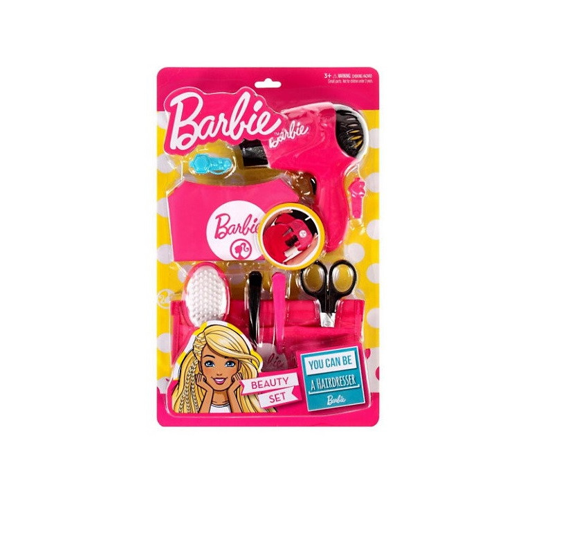 – több apró fodrász kellékből álló szett: olló, fésű, hajszárító, csattok és hordozó tok