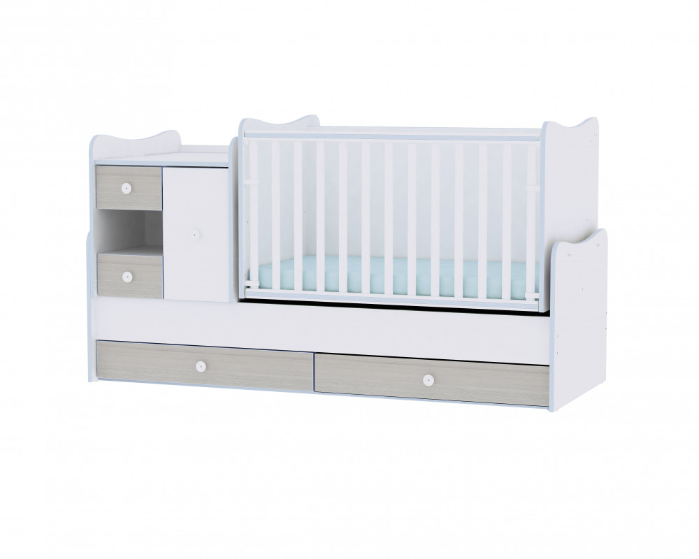 Lorelli MiniMax kombi ágy 72×190 – White & Blue Elm / Fehér & Kék csíkozás
